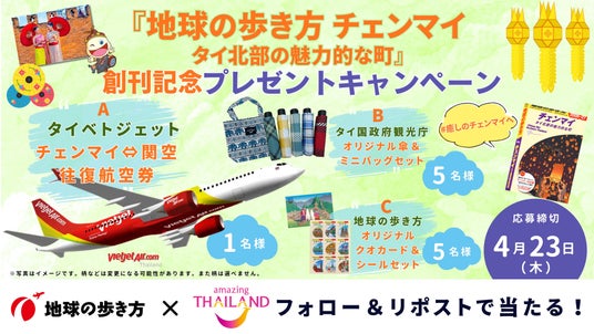 創刊を記念して、「地球の歩き方」と「タイ国政府観光庁」の公式X(旧Twitter)アカウントにて、「タイベトジェット」の往復航空券やオリジナルグッズなど豪華プレゼントが抽選で当たるコラボキャンペーンを開催いたします。たくさんのご応募をお待ちしています!