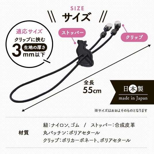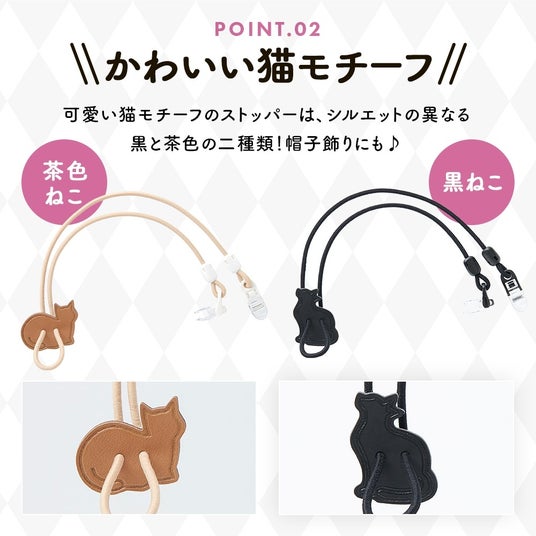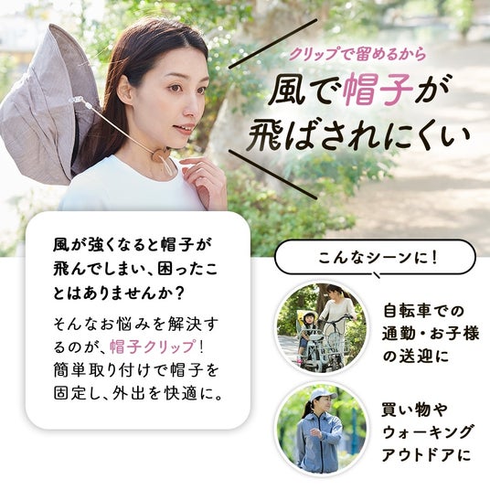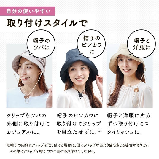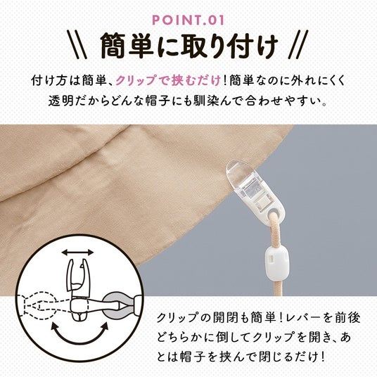 クリップで挟むだけの簡単取り付け!外れにくいクリップで、風で帽子が飛ぶのを防いでくれる帽子ストッパーです。かわいいねこのストッパーでサイズ調節が可能。帽子のツバやビンカワにあご紐のように取り付けたり、帽子のツバと洋服に取り付けたりと、取り付け方もいろいろ!