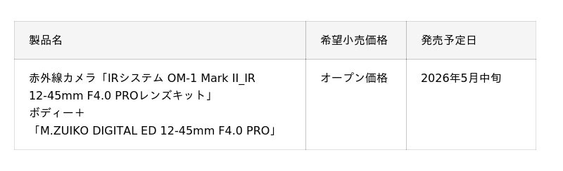 OMデジタルソリューションズ株式会社(代表取締役社長 兼CEO:杉本 繁実)は、赤外線を使った調査、研究、検査に最適な業務用赤外線カメラ「IRシステム(Infrared rays Record&Research System) OM-1 Mark II_IR」を2026年4月9日から日本国内の法人・個人事業主のお客さま向けにOM Business Store(URL: https://biz.om-digitalsolutions.com/)で受注開始いたします。