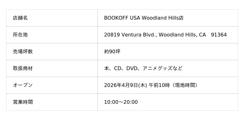 ブックオフグループホールディングス株式会社(本社:神奈川県相模原市、代表取締役社長:堀内 康隆、以下、ブックオフ)の海外グループ企業であるBOOKOFF U.S.A. INC.(代表取締役社長:平田 和也)は、アメリカ合衆国カリフォルニア州ロサンゼルス市に、現地にて買取・販売を行うリユース業態「BOOKOFF」の21店舗目となるWoodland Hills(ウッドランドヒルズ)店を現地時間の2026年4月9日(木)午前10時にオープンいたします。この出店により海外店舗数は50店舗を突破いたします。マレーシアなどにおいて日本から輸出した商品を販売するリユース業態Jalan Jalan Japan(ジャラン・ジャラン・ジャパン)事業立ち上げからの10年間で海外店舗数は4倍以上へと成長いたしました。コロナ禍の動画配信サービスの台頭などにより世界中でアニメ人気が加速したことが出店拡大の後押しとなっております。中期経営方針に基づき、海外事業では2033年にBOOKOFF事業で100店舗、Jalan Jalan Japan事業で100店舗の合計200店舗体制を目標に据え、今後も積極的に出店を進めてまいります。