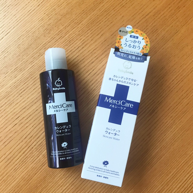 これは、新生児から使える肌にやさしいスキンケアシリーズの化粧水。パラベンやエタノール、着色料や香料無添加で、かきむしりによる湿疹がひどいうちの娘が、これを使って改善されたのですよ。