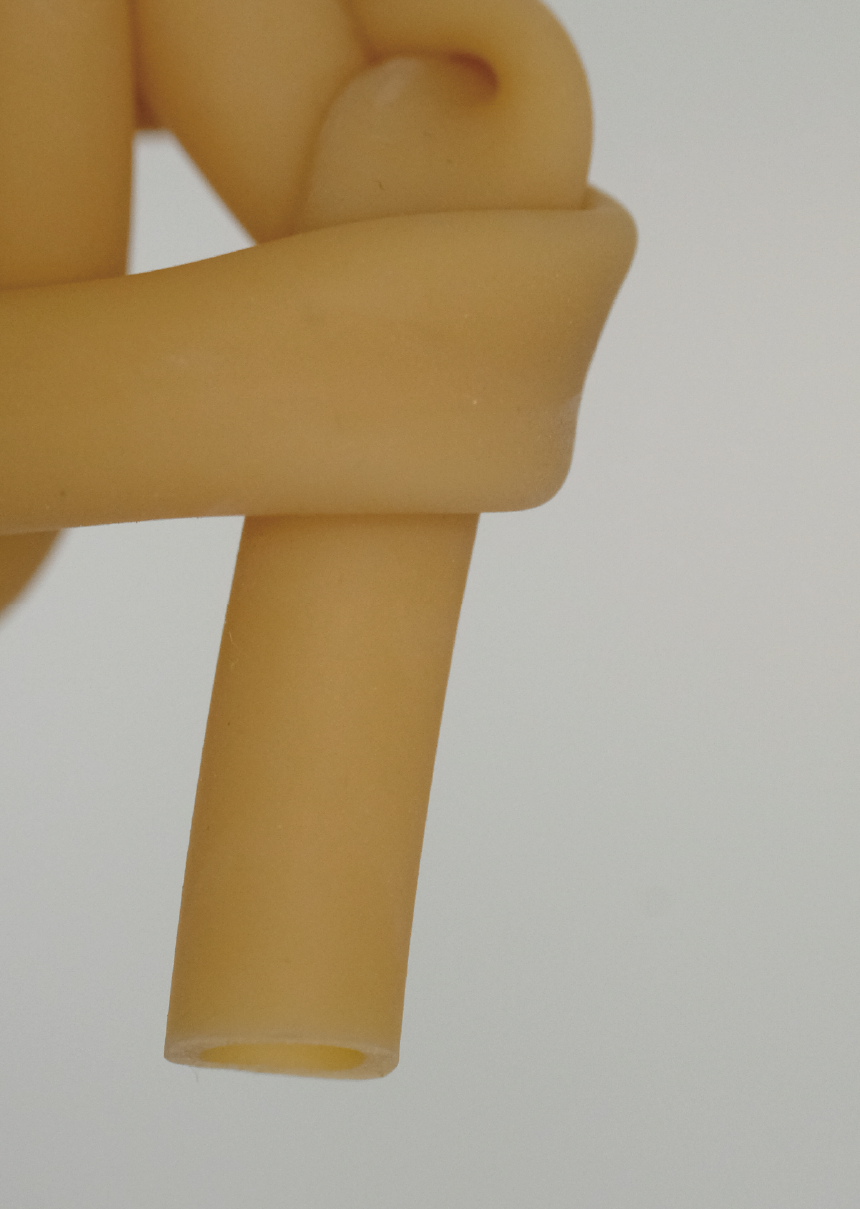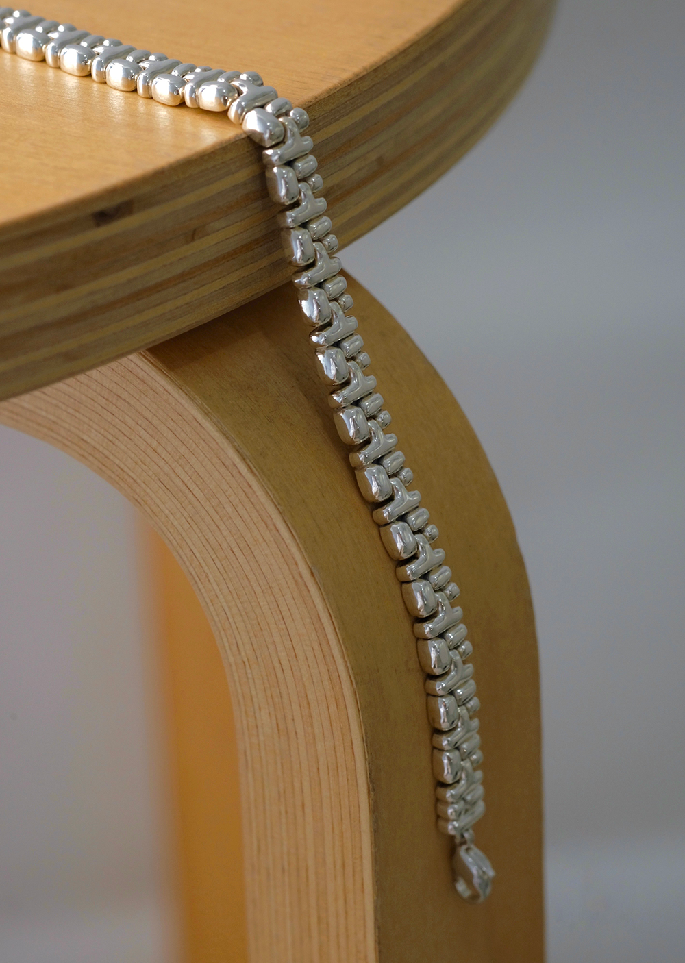 本展ではジュエリーブランドPasoの定番商品に加え、工業用チューブから着想を得た新たなシリーズ「space(余白)」を発表します。柔らかく屈折したジュエリーディテールは「曲げる」という最小単位の操作により生まれ、しなやかに動く曲線により余白のある美しさを演出します。