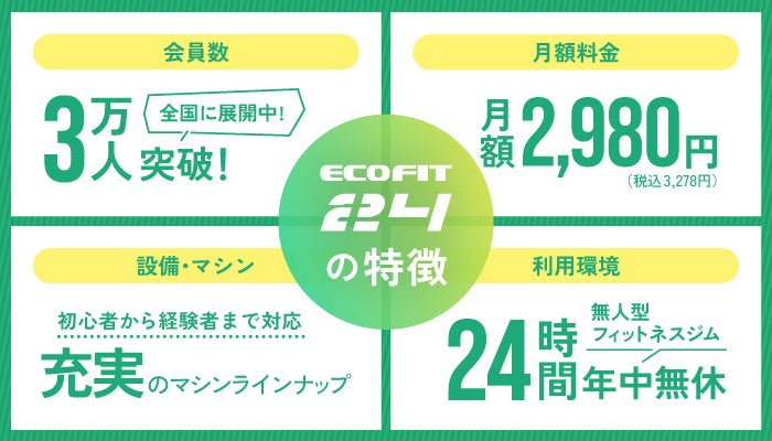 「エコフィット24」は、月額2,980円(税込3,278円)で利用できる24時間フィットネスジムです。無人運営と効率的な設備設計により、低価格と収益性を両立したビジネスモデルを特徴としています。
