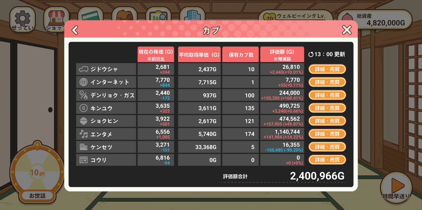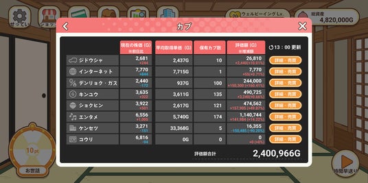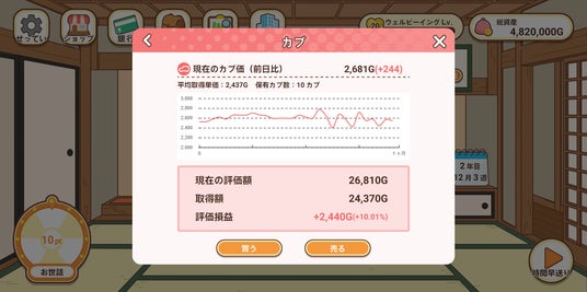 『チキュウで暮らす』内では「カブ」を売買することができます。ゲーム内のカブ価は、現実の日本の株価と連動しており、それぞれの業界ごとの大手10社の平均株価になっています。たとえば「ジドウシャ」カブは、大手自動車関連企業10社の平均株価です(企業名は非公開)。各株の前日の終値をゲーム内のカブ価に反映しています。