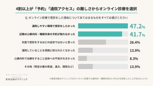 【オンライン診療を選ぶ理由】約4割が「予約」「通院アクセス」の難しさから心療内科・睡眠外来のオンライン診療を選択。「通院を知られたくない」等の心理的課題に対し、約1割がオンラインの匿名性を利点として回答。