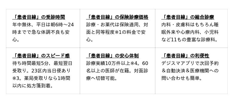 オンライン診療の特長:「患者目線のクリニック」のオンライン診療は、初診からのオンライン診療を提供し、11もの診療科をもつ総合診療クリニックです。私たちは「患者目線」を徹底し、平日早朝6時から24時まで・土日祝含む年中無休の幅広い診療時間、安心の保険診療価格、最短翌日にお薬が届くスピード感、そしてアプリ1つで完結する高い利便性を実現しました。都内に実院を構え、必要に応じて対面診療へもスムーズに切り替えられます。デジタルの速さと、対面診療の安心感を両立し、患者さまの健康を最短ルートで支えます。