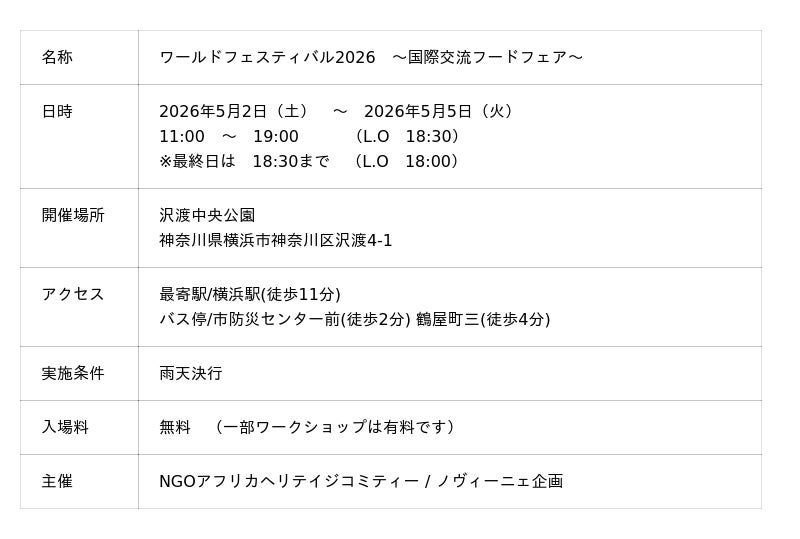 ノヴィーニェ企画(運営:NGOアフリカヘリテイジコミティー、代表:トニー・ジャスティス)は、2026年5月2日(土)~5日(火・祝)の4日間、横浜市・沢渡中央公園にて「ワールドフェスティバル2026」を開催いたします。