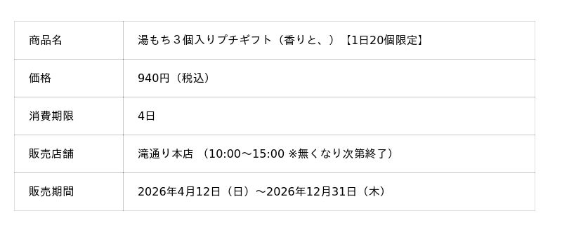 箱根湯本で和菓子の製造・販売を行う有限会社ちもと(神奈川県足柄下郡箱根町、代表取締役:杉山隆寛)は、2026年4月12日に、ちもと滝通り本店にて大変ご好評いただいている「やわはだ湯もち」の発売1周年を迎えます。これを記念し、4月12日(日)~12月31日(木)まで、日本画家・丁子紅子氏が同商品のために描き上げた作品『香りと、』をあしらった、「湯もち3個入りプチギフト(税込940円)」を、滝通り本店にて1日20個限定で販売いたします。