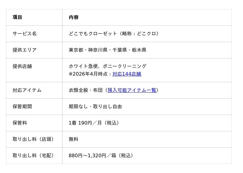 株式会社サマリー(本社:東京都千代田区、代表取締役:日下部康介)は、衣替えシーズンを前に、クリーニング店舗を起点とした衣類保管サービス「どこでもクローゼット」(略称:どこクロ)の展開を開始しました。ホワイト急便およびポニークリーニングと協業し、2026年4月時点で東京・神奈川・千葉・栃木の計144店舗で展開しています。