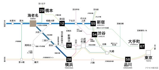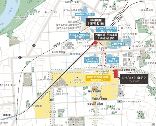 当物件は、小田急小田原線・相鉄本線・JR相模線「海老名」駅より徒歩8分の場所に位置しており、横浜、新宿、渋谷、大手町など神奈川や東京の主要駅へダイレクトアクセスが可能な交通利便性の高い立地です。特に小田急小田原線は特急停車、相鉄本線においては始発駅であることから、都心へ快適に移動できます。さらに、圏央道「海老名IC」を車で約7分で利用でき、県内外への移動にも優れております。