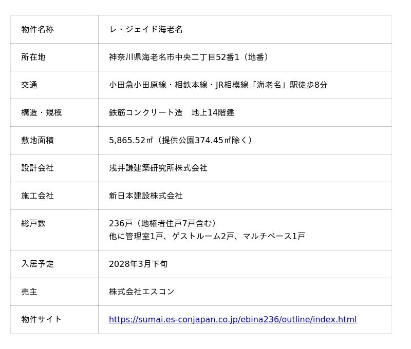 株式会社エスコン(本社:東京都港区、代表取締役社長:伊藤貴俊)が神奈川県海老名市において手がける、新築分譲マンション『レ・ジェイド海老名』につきまして、2026年4月9日(木)より分譲開始いたしますので、お知らせいたします。当物件は、海老名市役所周辺で進む新街区整理事業エリア内に位置しており、充実した共用部を設けた全236戸の大規模レジデンスです。