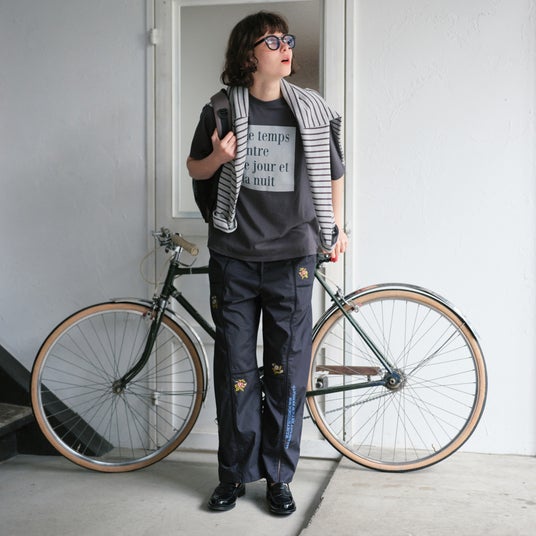 タイポグラフィープリントTシャツ ¥4,400、配色ボーダープルオーバー ¥6,160、パッチワーク風パンツ ¥14,300