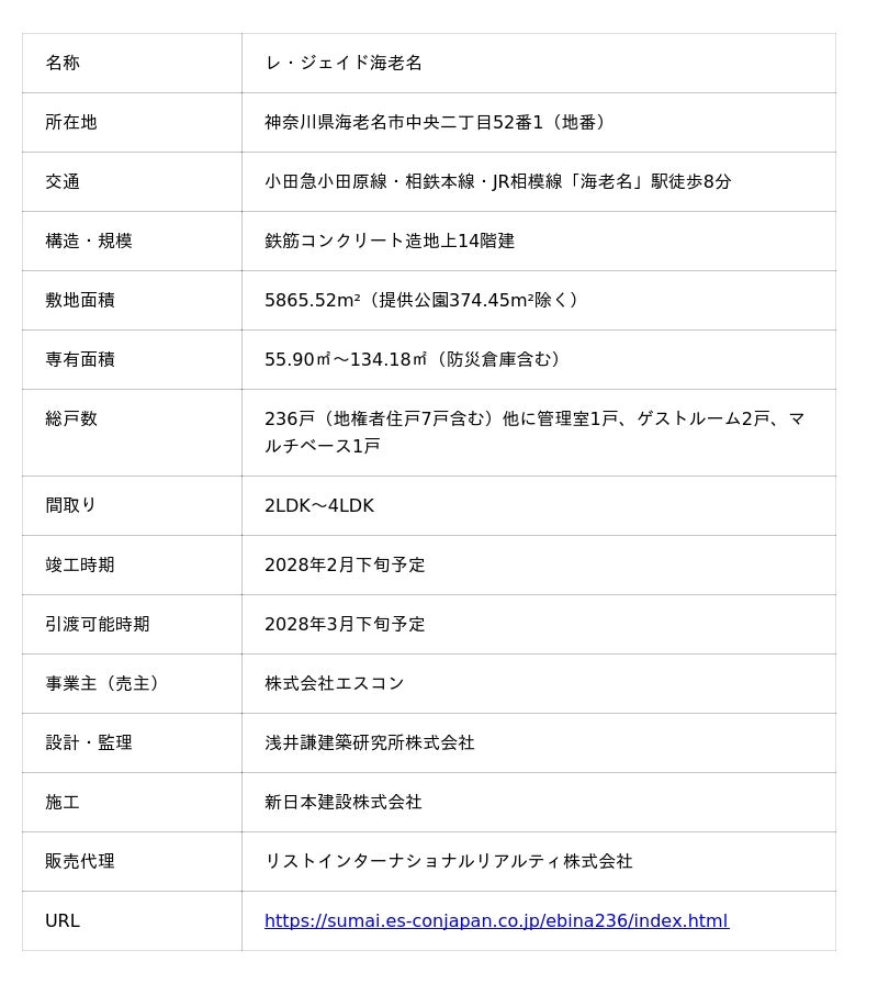 総合不動産企業、リスト株式会社(代表取締役社長:北見尚之、本社所在地:神奈川県横浜市)の連結子会社であるリストインターナショナルリアルティ株式会社(代表取締役社長:北見尚之、本社所在地:神奈川県横浜市、以下「LIR」)は、株式会社エスコン(代表取締役社長:伊藤貴俊、本社所在地:東京都港区)が売主である新築分譲マンション「レ・ジェイド海老名(以下、本物件)」の販売代理を受託しました。なお物件案内会は2026年2月7日より開始しており、分譲販売は2026年4月9日より開始いたします。