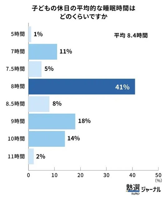 休日の平均睡眠時間は8.4時間と、平日よりも長くなる傾向が見られます。学校がない分、起床時間の制約がなくなるためです。