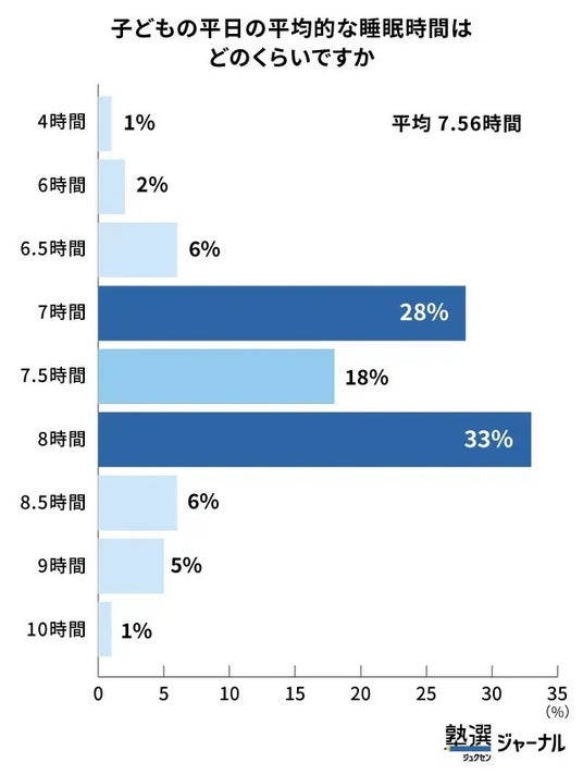 塾選ジャーナルの調査では、平日の平均睡眠時間は7.56時間でした。厚生労働省が推奨する8~10時間と比べると、少なくとも約26分不足している計算になります。