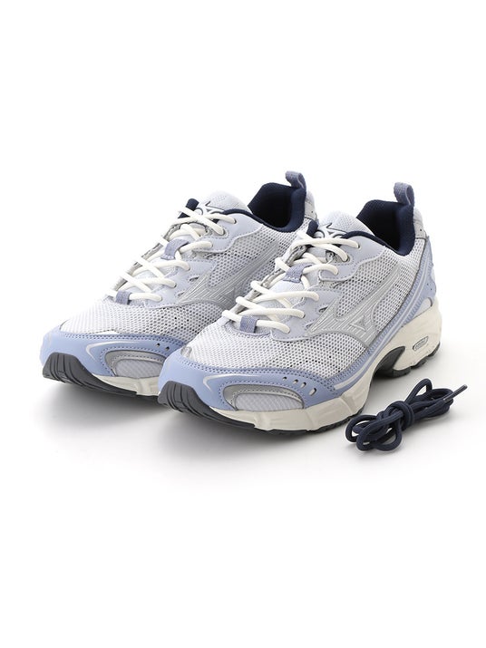 2000年代ランニングの代表的モデルである「MXR」をベースに別注。「MXR」の特長であるアッパーの2層のメッシュ構造を生かす淡いブルーのワントーン、ネイビーやシルバーを加え、軽やかな中にも立体的な表情感をプラス。清涼感のあるカラー使いで、春の装いを軽やかに。インソール・ミッドソールにemmiロゴ入り。