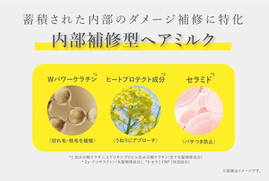 *1 加水分解ケラチン、ヒドロキシプロピル加水分解ケラチン(全て毛髪補修成分)、* 2γ-ドコサラクトン(毛髪補修成分) 、*3 セラミドNP (保湿成分)
