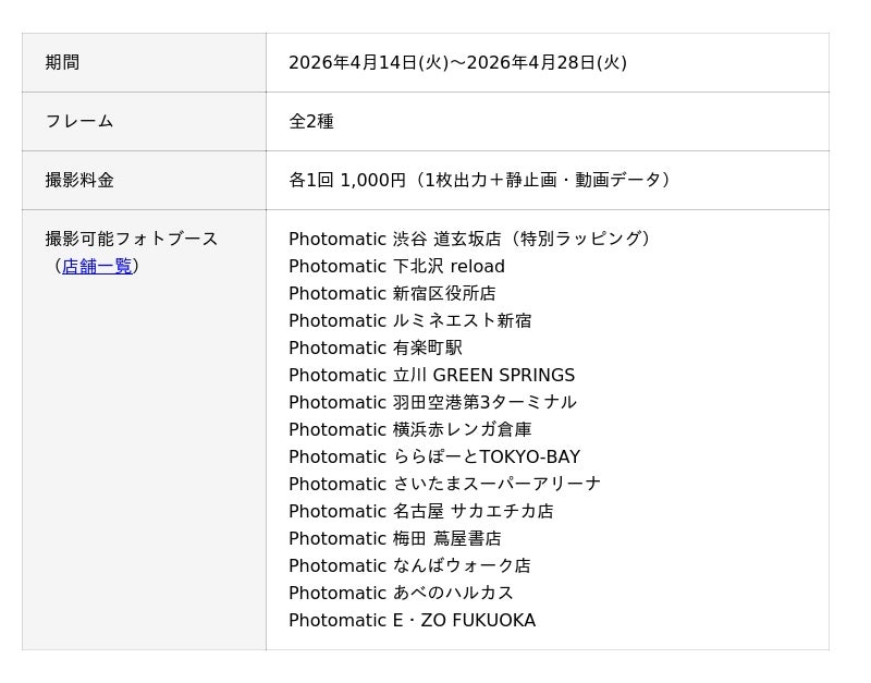 キタムラ・ホールディングス グループの株式会社フォトクリエイト(本社:東京都新宿区、代表取締役社長:大迫 由典)が運営するセルフフォトブランド「Photomatic(読み:フォトマティック)」は、KAMITSUBAKI STUDIOが手掛ける次世代アーティストプロジェクト「少女革命計画」の1st LIVE/第一幕『改変』Blu-ray発売を記念し、2026年4月14日(火)より期間限定のコラボレーションを実施いたします。東京・大阪・名古屋など全国15カ所のフォトブースで撮影をお楽しみいただけます。