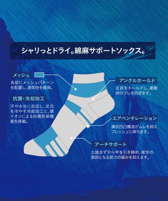 ドライエアソックスは、綿麻ならではのシャリ感ある風合いに、通気の工夫とサポート設計を組み合わせた一足。運動時も日常も心地よく履けるように整えました。