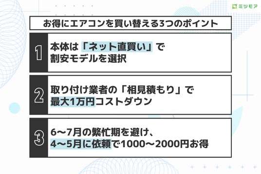 ・買い替えは、エアコン本体の「ネット直買い」+設置業者の「相見積もり」が最安ルート