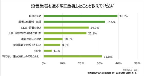 また、業者選びの実態について伺いました。エアコン設置業者を選ぶ際に重視することを尋ねたところ、最も多かった回答は「料金の安さ(39.3%)」、次いで「業者の信頼性・実績(32.6%)」でした。基本的な料金の安さはもちろん、業者選びの際には「コストパフォーマンス」と「信頼できるか」の両立を重視していることが分かります。