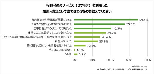 ミツモアを利用したユーザーからは、「複数業者の料金比較が簡単にできた(69.5%)」「予算や希望にあう業者を見つけられた(55.3%)」といった回答が寄せられており、相見積もりの手間を解消しながら、納得のいく業者選びを実現している様子が伺えます。