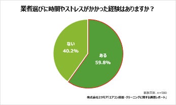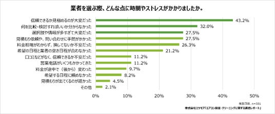 一方、業者選びに時間やストレスがかかった経験に関して、「ある」と回答した人は59.8%と、全体の約6割を占めました。「(口コミや評価を見て)信頼できるか見極めるのがたいへんだった(43.2%)」「何を比較・検討すればいいか分からなかった(32.0%)」といった声が多くあがり、最適な業者選びにあたり、選択肢の多さや業者選びの過程そのものに手間とストレスがかかっていることがわかりました。