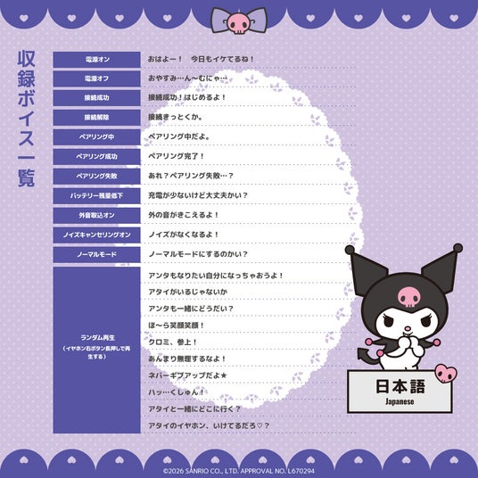 イヤホンの起動 / 終了や端末との接続状況をお知らせする「ボイスガイダンス」に加え、「シナモロール」「クロミ」が話しかけてくれる 「ランダムボイス」を新規オリジナルボイスで各40種類以上収録。 [日本語 /English] の2モードは 専用アプリで自由に切り替えることができます。シナモロールとクロミがあなたの日常に元気と癒やしを与えてくれます。