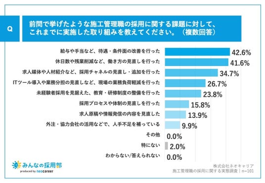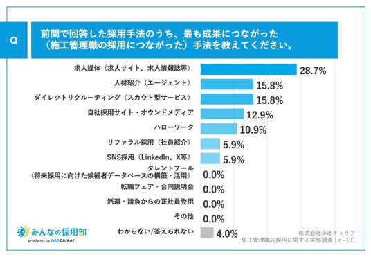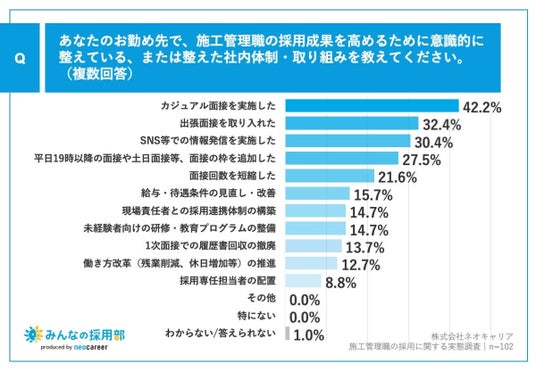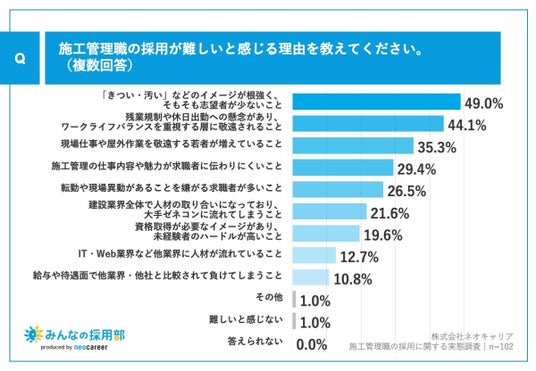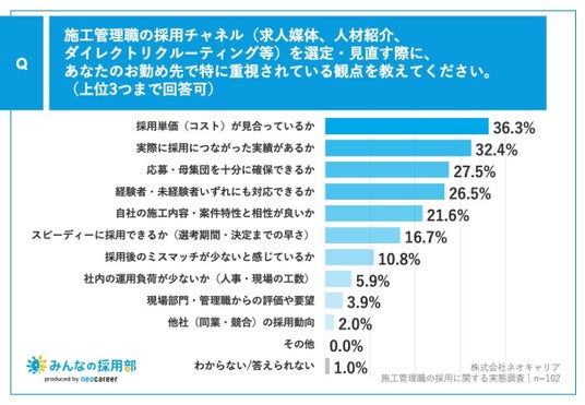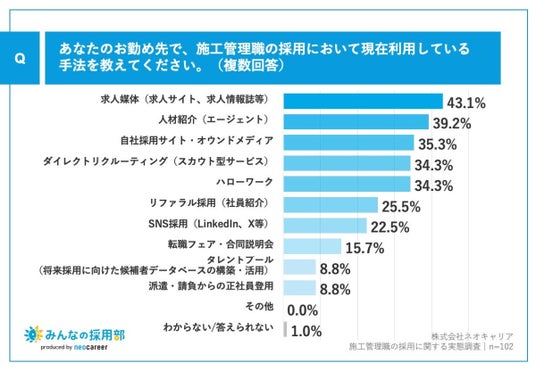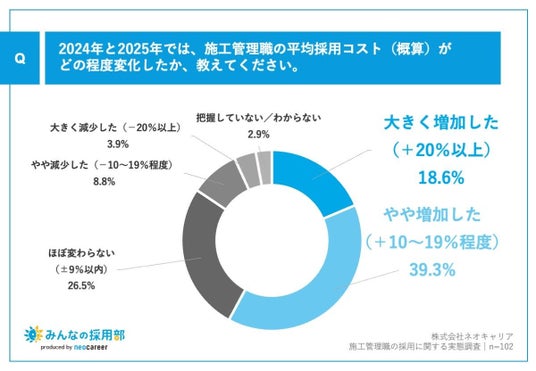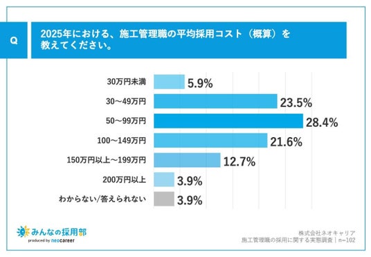株式会社ネオキャリア(本社:東京都新宿区 代表取締役CEO:西澤 亮一、以下「ネオキャリア」)が運営する、企業の採用活動を包括的に支援する人材サービスの総合代理店「みんなの採用部」(https://www.neo-career.co.jp/humanresource/)は、2025年に施工管理職を10名以上中途採用した建設業の採用担当者102名を対象に、施工管理職の採用に関する実態調査を実施しました。