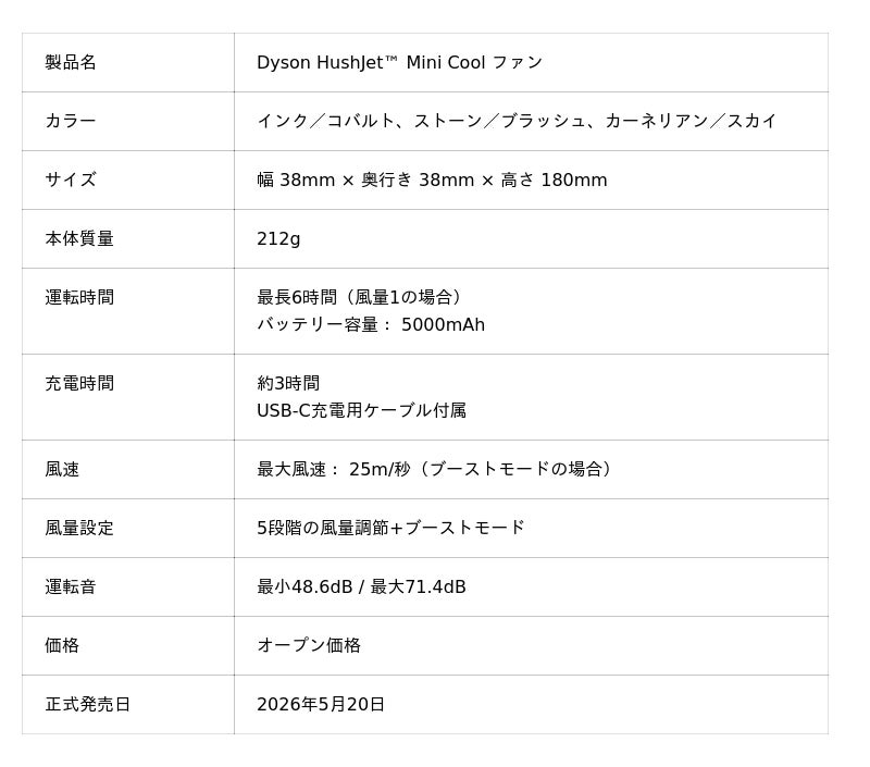 ダイソン株式会社(東京都千代田区:代表取締役社長 添田 成久、以下ダイソン)は、ダイソン初のポータブルハンディファン「Dyson HushJet(TM) Mini Cool(ダイソン ハッシュジェット ミニクール) ファン」を発表しました。2026年5月7日(木)より、ダイソン公式オンラインストアで限定先行販売を開始します。5月20日(水)より、家電量販店などで順次販売を開始します。