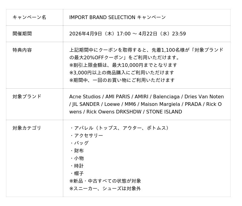 あわせて、4/9(木)より人気のインポート・ラグジュアリーブランドをさらにお得に購入できる「IMPORT BRAND SELECTION キャンペーン」を開催します。期間中は一部対象ブランドが最大10,000円オフでお買い求めいただけます。