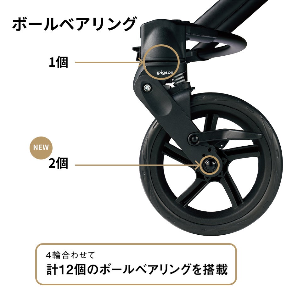 【1】軽い力で、どこまでもスムーズ。ベアリング増設による「押しやすさの進化」スムーズな方向転換を支える従来のキャスター軸(4か所)に加え、今回新たに前後輪すべての車軸(8か所)にもボールベアリングを採用。4輪合わせて合計12個のボールベアリングを搭載することで、さらなる押しやすさを実現しました。ボールベアリングは、内部の精密なボールが点で接して転がることで、回転の抵抗となる摩擦を極限まで抑える構造を持っています。このベアリングを増設したことで、従来品よりも軽やかな押し心地を実現しました。