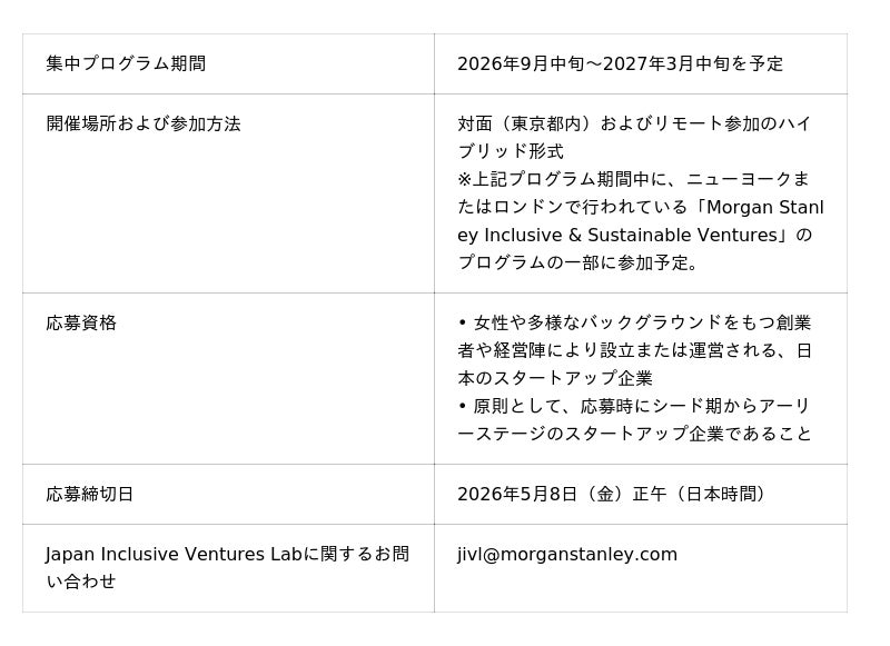 「Japan Inclusive Ventures Lab」(JIVL)は、三菱UFJモルガン・スタンレー証券が2024年に立ち上げたスタートアップ伴走プログラムで、三菱UFJフィナンシャル・グループ(MUFG)の戦略的パートナーであるモルガン・スタンレーが米州およびヨーロッパ・中東・アフリカ(EMEA)地域で展開している「Morgan Stanley Inclusive & Sustainable Ventures」を活用しています。JIVLは、MUFGとモルガン・スタンレーの強みを生かし、日本における世界基準のスタートアップ伴走を目指しています。