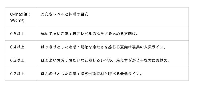 Q-max値の目安一覧 ※冷たさの感じ方には個人差があります