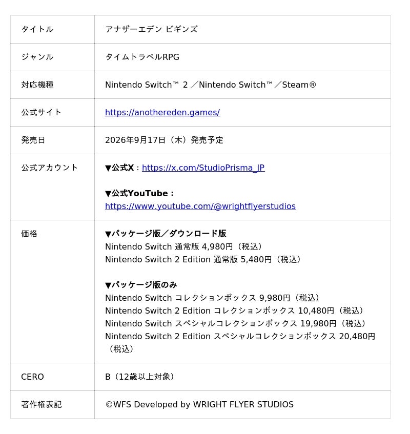 株式会社WFS(本社:東京都港区、代表取締役社長:柳原 陽太、グリーホールディングス100%子会社、以下「当社」)の「ライトフライヤースタジオ」が販売、「スタジオプリズマ」が企画・開発する、Nintendo Switch(TM) 2/Nintendo Switch/Steam(R)向け新作タイムトラベルRPG『アナザーエデン ビギンズ』を2026年9月17日(木)に発売することを決定しました。
