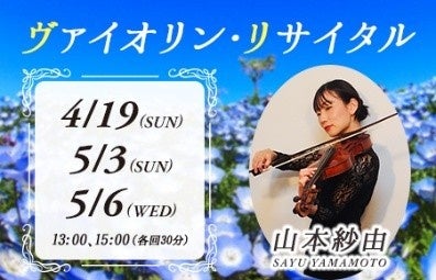 「ネモフィラ祭り2026」を盛り上げる各種イベントの開催が決定いたしました。ゴールデンウィーク中には、山本紗由氏によるヴァイオリン・リサイタルを上演し、ネモフィラが広がる景色の中で、美しい演奏を楽しむことが出来ます。さらに、4月25日(土)~4月30日(木)の6日間は、世界最年少で大道芸を始め、数多くのテレビ番組にも出演経験のある、大道芸人ハンド氏によるパフォーマンスも披露します。