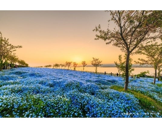 春に見頃を迎える桜やチューリップとネモフィラのコラボゾーンを設置しています。青一面のネモフィラ畑とはまた違った風景をお楽しみいただけます。また、開催期間中の土日祝日は、ロング営業(9:00~18:30 ※最終入園18:00)を実施します。水平線に沈みゆく夕陽と、オレンジ色に照らされ紫に輝くネモフィラの絶景コラボを、ぜひお楽しみください。
