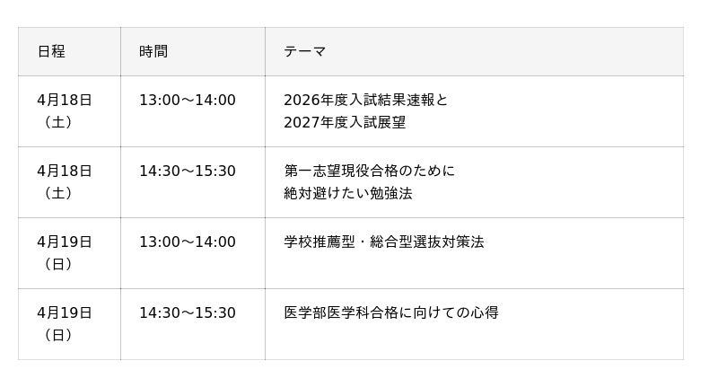 新学期を迎えたばかりの高校生・中学生を対象に、大学受験に関する以下の4つのテーマ別でセミナーを開催します。