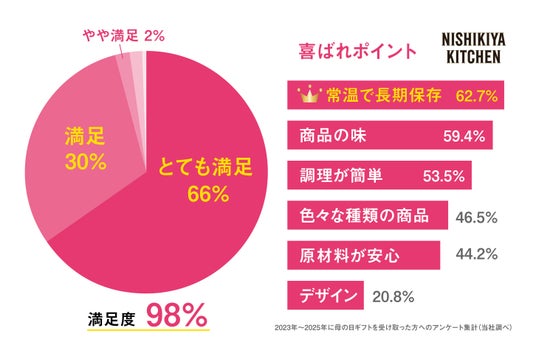 ニシキヤキッチンの母の日ギフトを受け取ったお母さんを対象にした2023年~2025年のアンケートでは、98%*の方に「とても満足」「満足」「やや満足」と回答していただき、贈り物として大変喜ばれています。*2023年~2025年に母の日ギフトを受け取った方へのアンケート集計(当社調べ)