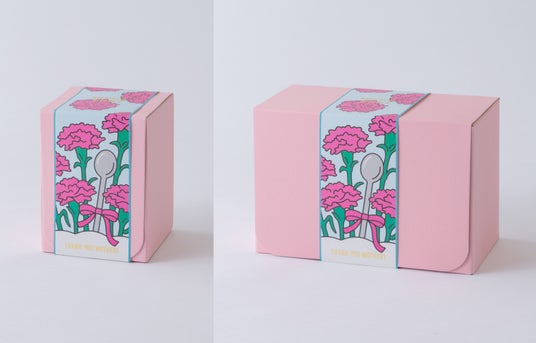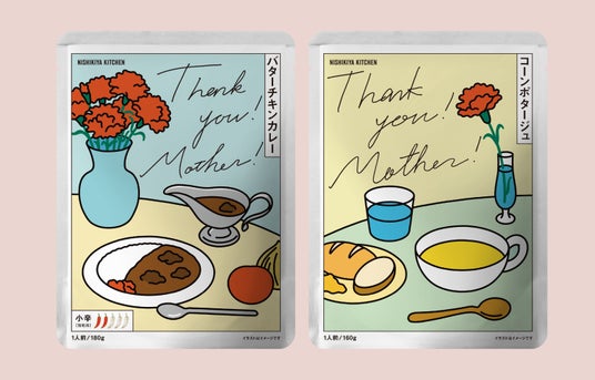 母の日限定パッケージの「バターチキンカレー」と「コーンポタージュ」は2つの絵柄を合わせるとひとつのテーブルのようにも見え、ユーモア溢れる仕上がりになっています。
