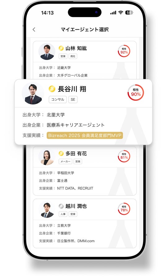 価値観と経験に合ったエージェントを、ユーザーが自ら選んで相談できる機能です。エージェントの得意領域や支援ポリシー、出身大学・出身企業、支援実績まで確認した上で選択できます。