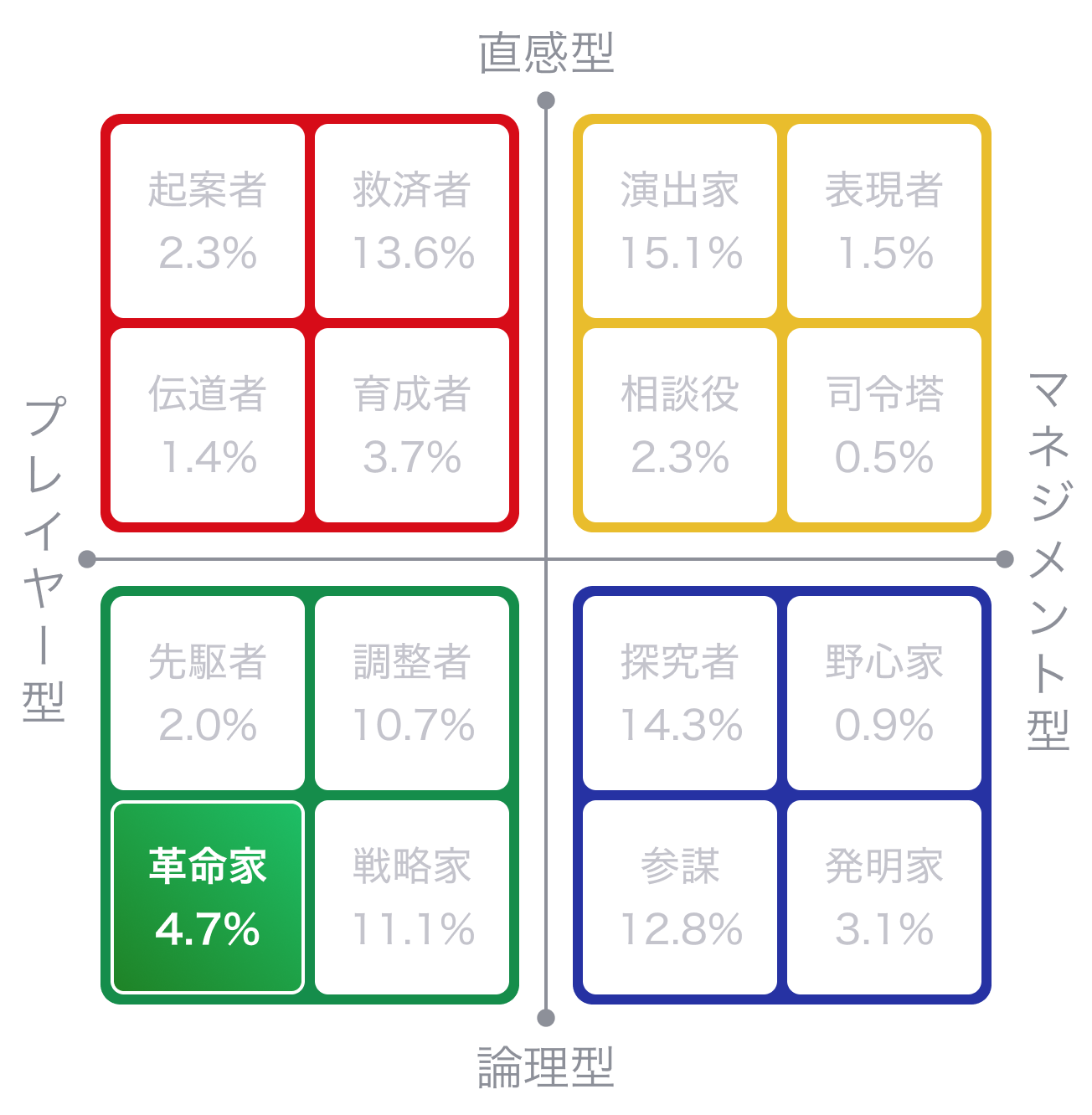 たとえば直感型×プレイヤー型の「起案者」は着想を行動力で素早く形にするタイプ、論理型×マネジメント型の「参謀」は分析と思考の深さで組織の頭脳となるタイプなど、仕事への向き合い方がタイプごとに異なります。