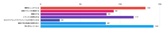 新生活中のコンディション維持のための行動については、「睡眠をしっかりとる」「リラックス時間を作る」などの基本的な対策に加え、セルフケアの一環としてサプリメントなどの栄養補助を取り入れるという回答も一定数見られました。