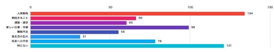 次いで、「新しい仕事・学業」「将来への不安」などが上位に挙げられ、環境の変化に伴う精神的・身体的な負担の両面が浮き彫りとなっています。