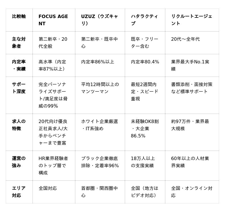 こうした背景のもと、株式会社CAREER FOCUS(所在地:東京都、代表取締役:東田尚起)が運営する転職エージェント「FOCUS AGENT」は、主要4サービスの特徴を整理した比較情報を2026年4月に公開しました。