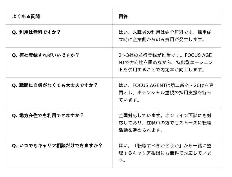 FOCUS AGENTは、20代・第二新卒世代の求職者を第一に考えるエージェントです。同時に採用企業向け支援(Indeed・AirWork等の求人広告運用)を300社以上に提供してきた知見を活かし、「企業が実際に何を評価しているか」「書類審査のどのポイントで落ちているか」を求職者の側に立って正直にフィードバックします。求職者の利益を最優先にした情報提供がFOCUS AGENTの姿勢です。