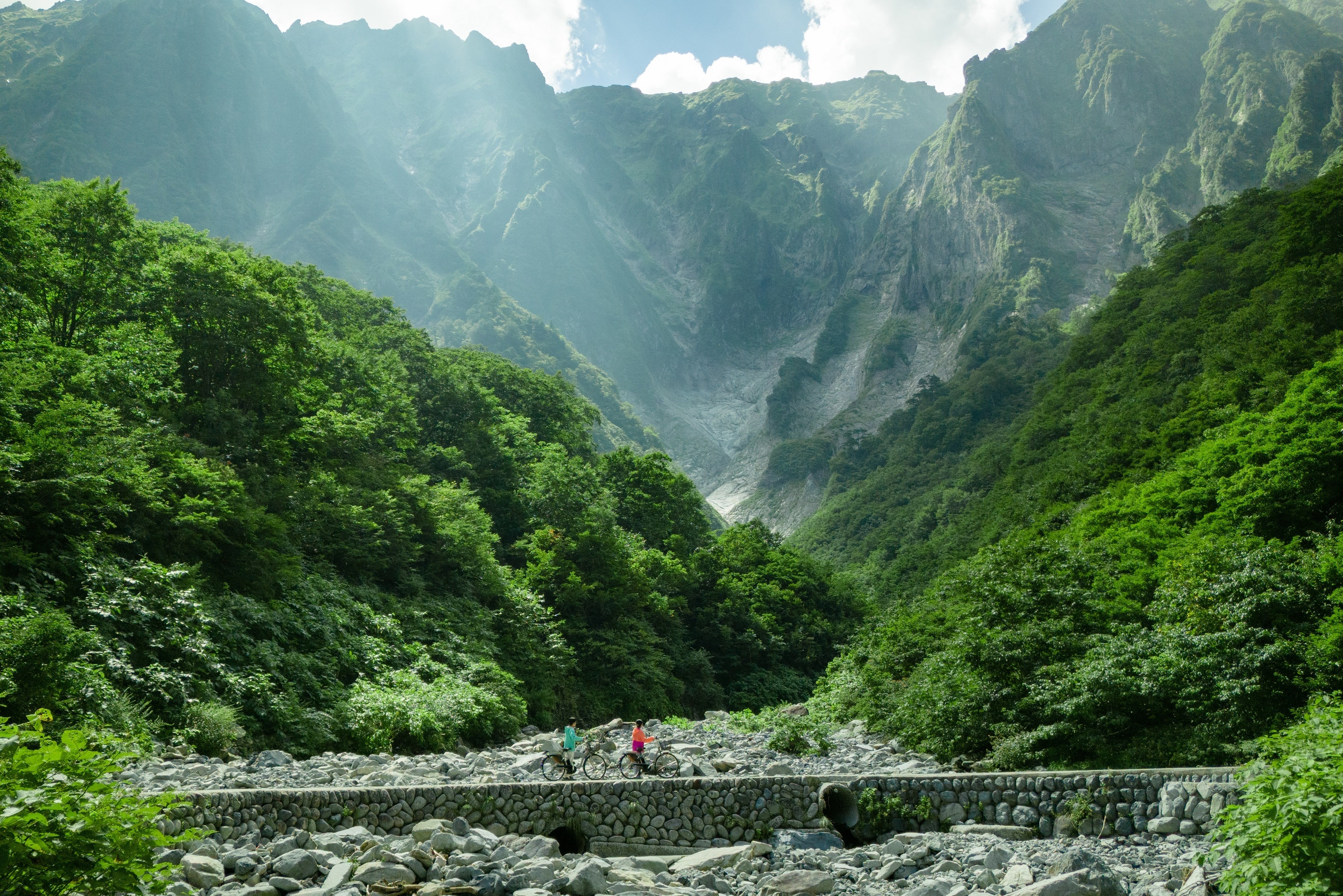 足水を行う一ノ倉沢までは舗装された約3kmの平坦な道路が通っており、電動アシスト付きの自転車で道中も快適に走行可能です。自然環境保護などの理由からマイカー規制がされており、ブナやサワグルミの木立の中を、森林浴を楽しみながら進みます。道の途中には「風穴」という、地下の岩の隙間で冷やされた空気が吹き出している場所が点在しています。都会の猛暑と喧騒から離れ、移動中も天然の冷気に触れられる贅沢なアクティビティです。