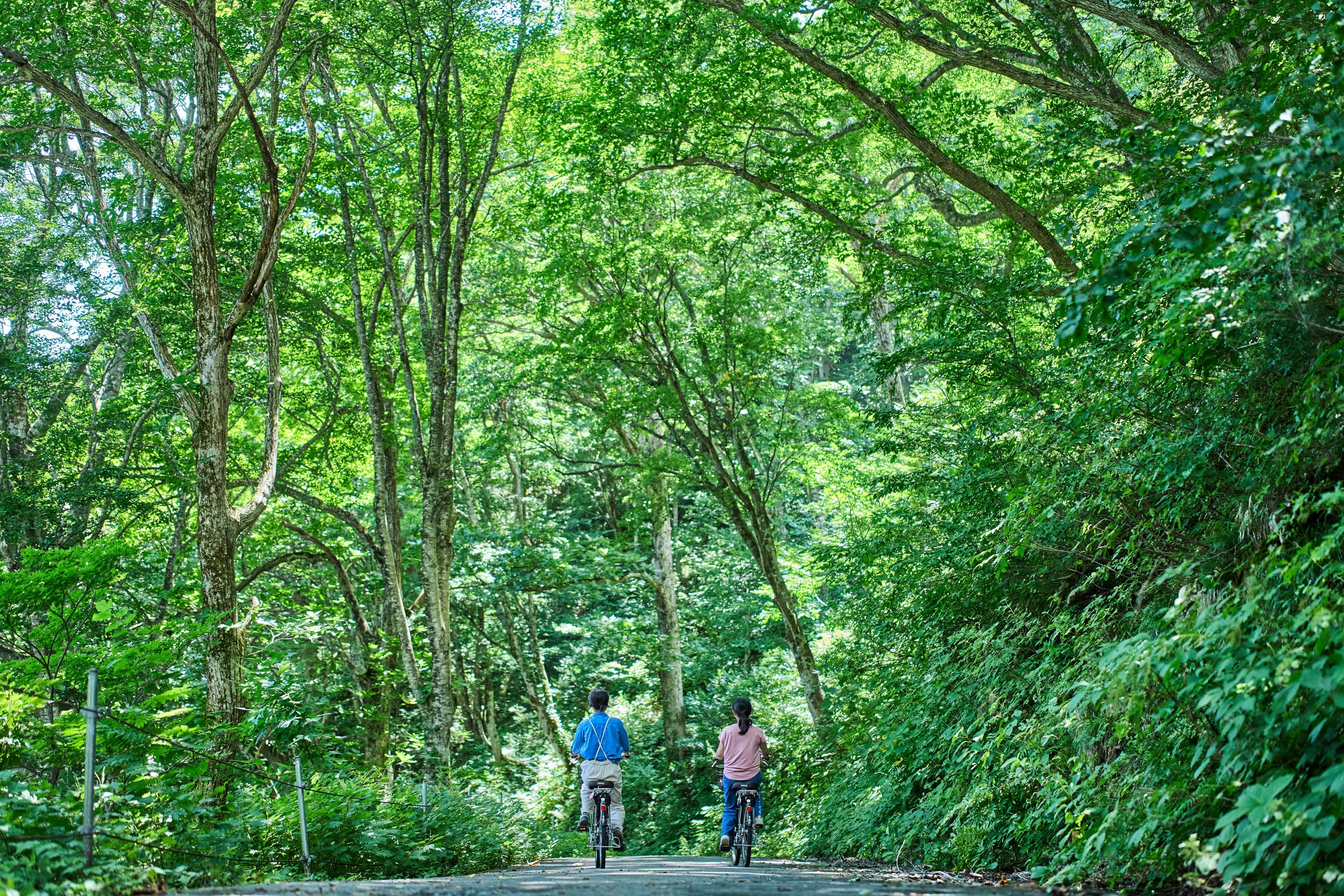 3 道中も涼しい、ブナの木漏れ日と風穴(ふうけつ)を感じるサイクリング