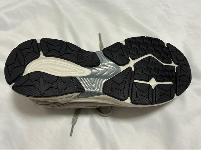 このスニーカー、カラーが本当におしゃれなんです。筆者が選んだファントムグレーは、ほんの少しピンクが混ざったようなくすんだグレー。靴紐まで同じトーンのグレーで統一されていて、ワントーンの上品な雰囲気に仕上がっています。