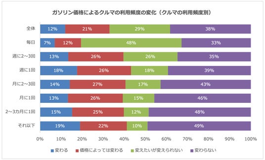クルマの利用頻度がガソリン価格によって変わるかを尋ねたところ、「変わる」12%、「価格によっては変わる」21%、「変えたいが変えられない」29%、「変わらない」38%という結果となりました。利用頻度別に見ると、毎日クルマを利用する人は48%が「変えたいが変えられない」、33%が「変わらない」と回答している一方、月に1回以下の利用者では「変わらない」が約半数を占めました。